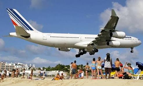 Adrenalin tutkunları kendilerine çarpacakmışcasına plaj üzerinden çok alçaktan iniş yapan dev uçakları izlemek için adaya akın ediyor.