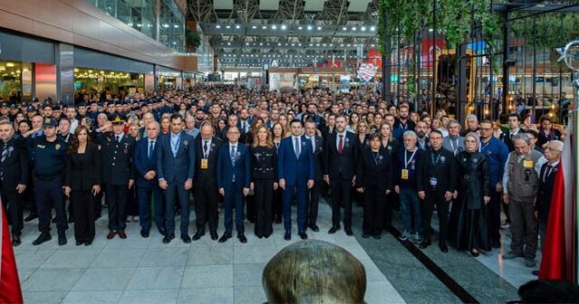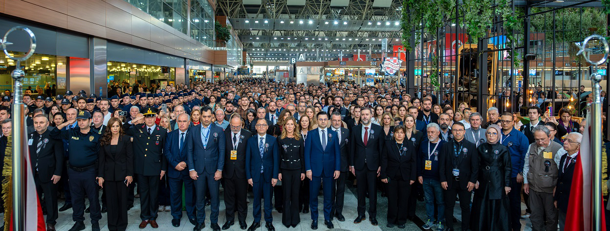 Saat 9’u 5 geçe sirenlerin çalmaya başlamasıyla Atatürk’e duyulan sevgi, saygı ve minnetin göstergesi olarak pasaport kontrolden check-in kontuarlarına tüm terminal genelinde Ulu Önder Mustafa Kemal Atatürk için saygı duruşunda bulunuldu, ardından İstiklal Marşı okundu.