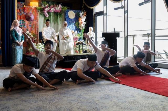 Malezya geleneklerine göre kompang grupları, ritmik ve senkronize vuruşlarla gelin ve damadın salona girişini onurlandırır ve misafirlerin dikkatini çeker.