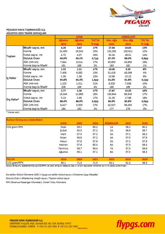 Pegasus Hava Yolları, Ağustos ve Ocak-Ağustos dönemine ilişkin trafik verilerini açıkladı.