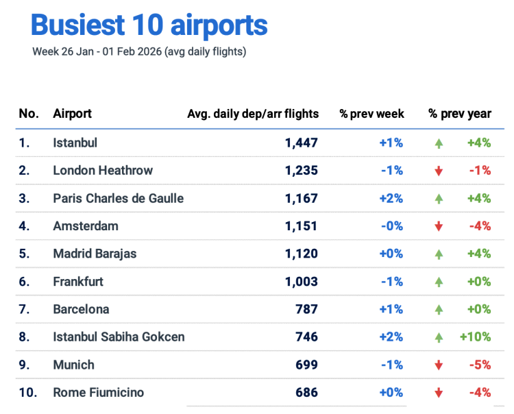 Eurocontrol’ün 26 Ocak – 1 Şubat 2026 haftasını kapsayan ortalama günlük uçuş verilerine göre Sabiha Gökçen’de günlük 746 iniş-kalkış gerçekleşirken, havalimanı bir önceki yıla kıyasla yüzde 10’luk artış yakaladı.