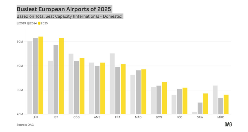 Havalimanlarını, arz edilen koltuk kapasitesi bazında derecelendiren OAG’ın “Avrupa’nın en büyük 10 havalimanı” değerlendirmesinde Sabiha Gökçen Havalimanı (SAW), 2025 yılında kapasitesini bir önceki yıla göre %15 artırarak 28,6 milyon tek yönlü (semi-route) koltuk kapasitesine ulaştı ve ilk 10 havalimanı arasında yıllık bazda en yüksek artışı kaydeden merkez oldu.